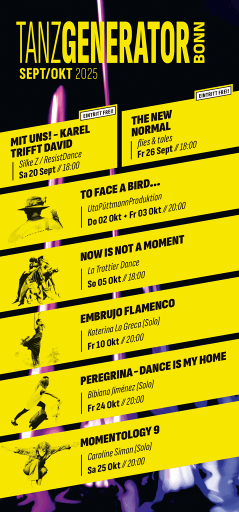 Der Name ist Programm: Gemeinsam schaffen die Künstler:innen mit dem Tanzgenerator Bonn eine neue Kraftzentrale und einen Motor für die unterschiedlichsten Entwicklungen im lokalen Tanzfeld, stellen Energie für Experimente und Raum für Begegnung und Austausch sowie neue Formate und Erfahrungen bereit. Der selbstgewählte Auftrag lautet: bündeln, wandeln, sichtbar machen, in Bewegung bringen!
