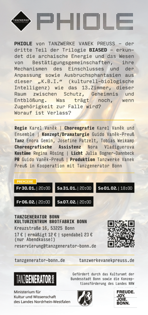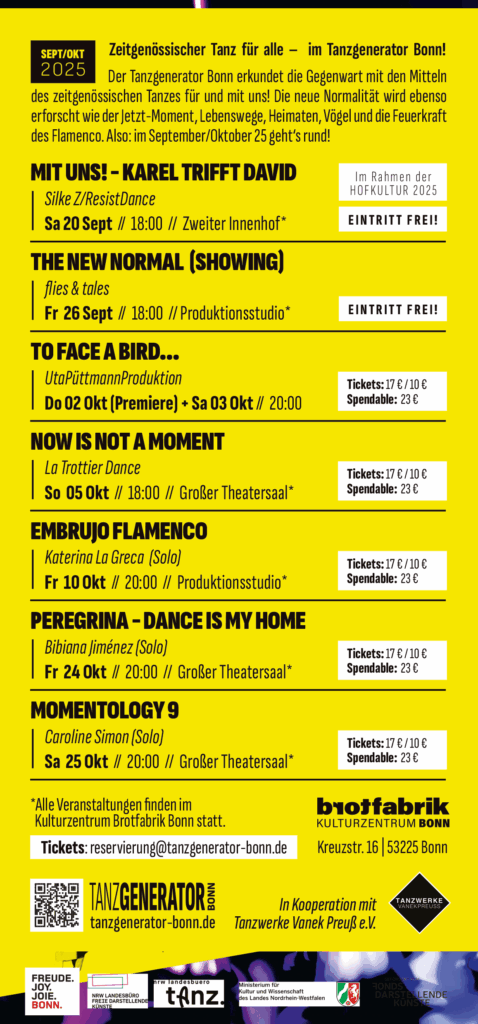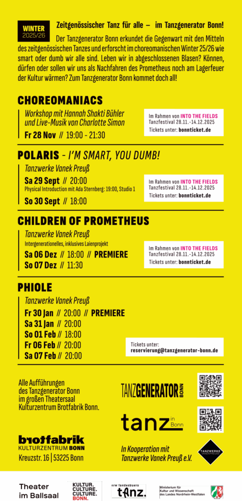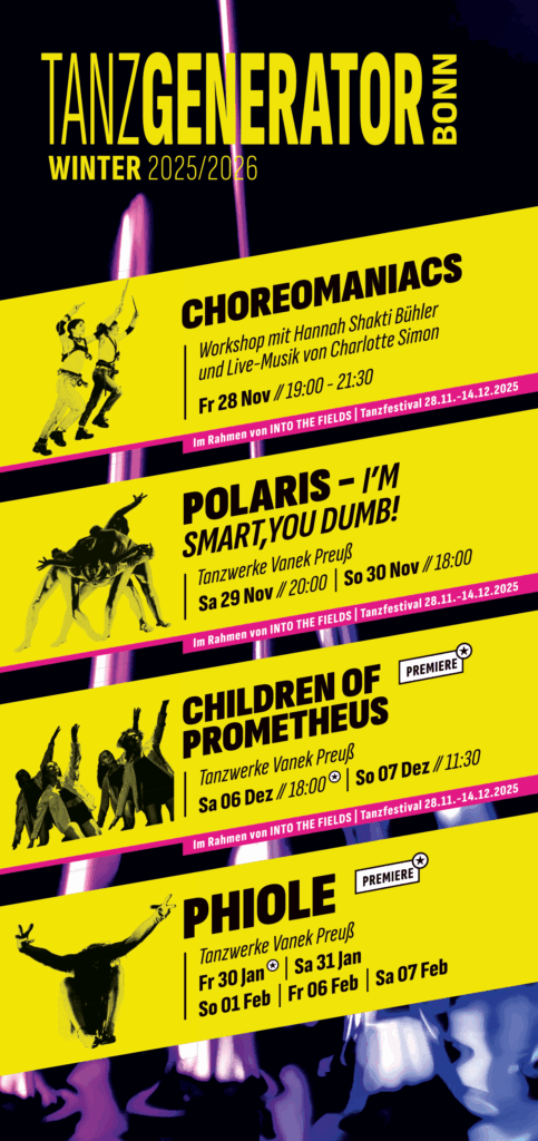 TANZGENERATOR BONN ist der Name der neuen, eigenständigen Sparte zeitgenössischer Tanz im Kulturzentrum Brotfabrik Bonn, die von Tanzwerke Vanek Preuß geleitet wird und in Kollaboration mit anderen Akteur:innen das vielgestaltige zeitgenössische Tanzangebot in der Brotfabrik ausrichtet.