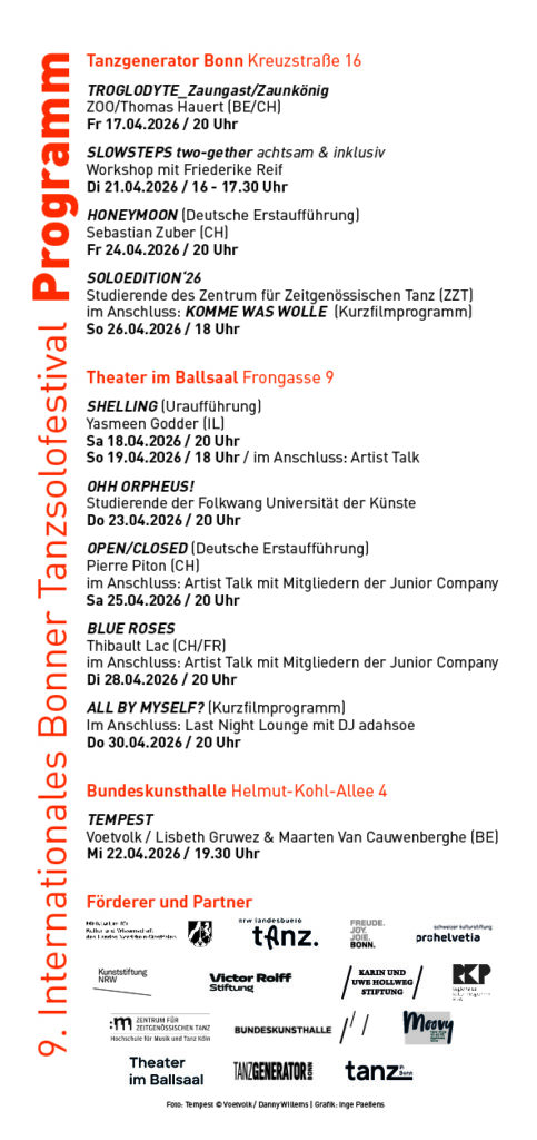 Dieses Tanzprogramm umfasst bislang neben den eigenen Produktionen von Tanzwerke Vanek Preuß, die durch eine eigene, institutionelle Förderung der Stadt Bonn, die Konzeptionsförderung des Landes NRW sowie weitere Projektförderungen finanziert werden, auch die Präsentation von Gastspielen anderer Tanzkünstler:innen – regional, überregional und international. In Kooperation mit Cocoon Dance ist der Tanzgenerator Bonn außerdem neben dem Theater im Ballsaal künftig die Partnerinstitution in der Umsetzung der vom Land NRW und der Stadt Bonn geförderten Festivals „Internationales Bonner TanzSolo Festival“, „Into the fields“ und „tanz nrw“.